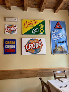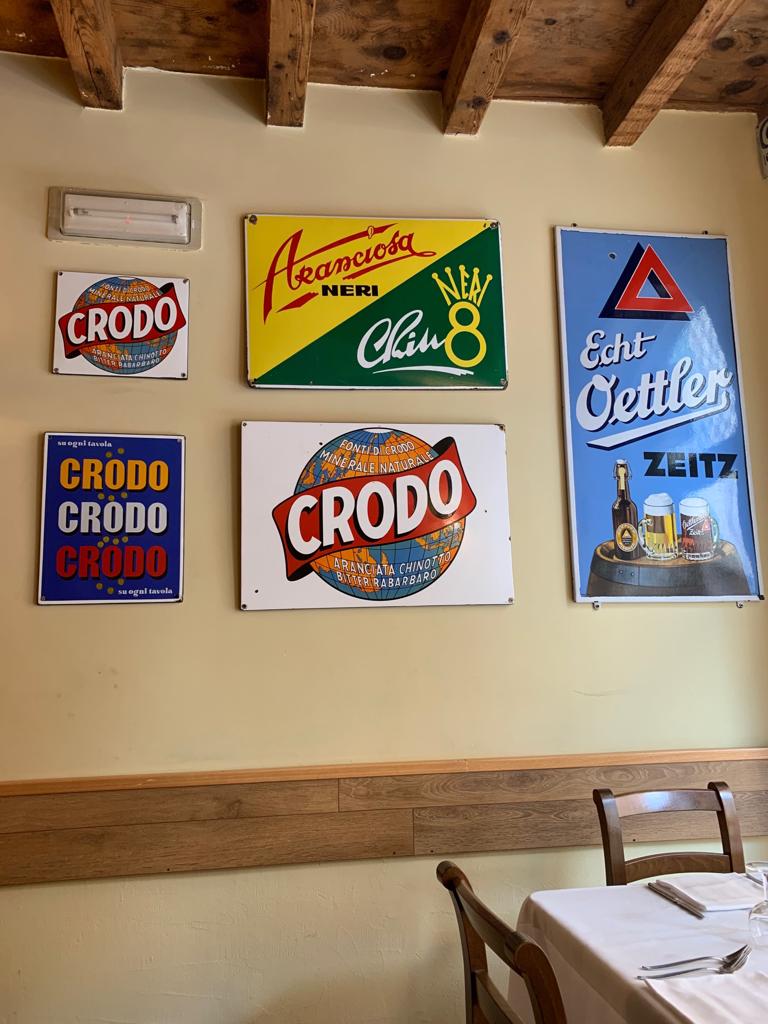 Entrerete in un ristorante inusuale, pieno di originali vecchie targhe e insegne; un luogo che sa di casa e dove puoi mangiare piatti sia di carne sia di pesce.